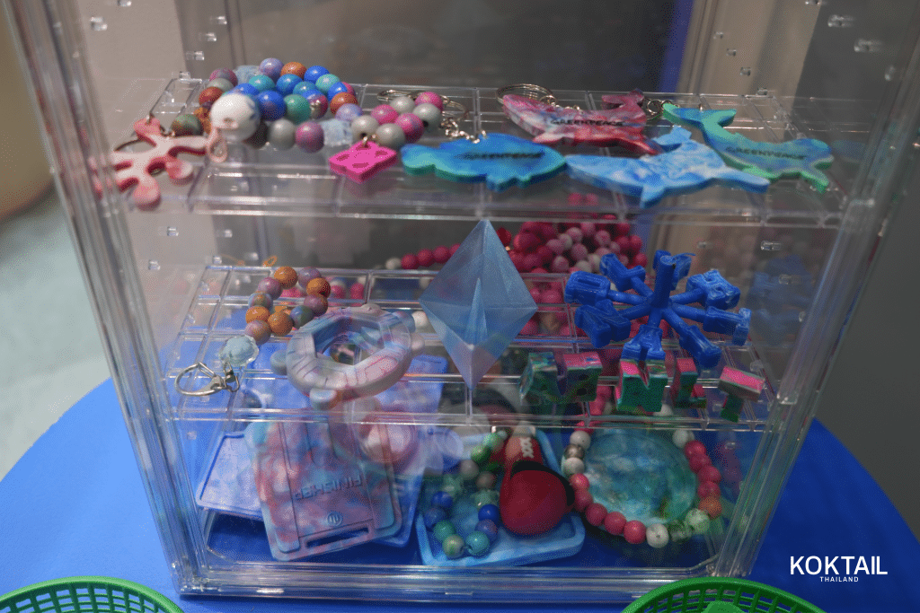 The collected waste is carefully cleaned, sorted, ground into pigments and moulded into a variety of shapes. Promrote began by creating small keyrings and sharing them on social media, which soon attracted interest from various organisations. From there he continued to develop his tools and processes to meet growing demand. Most of Poonsook Craft’s products are made to order, often for organisations hosting events that want sustainable souvenirs. This approach allows Promrote to control inventory while ensuring that each item he creates is both practical and meaningful.