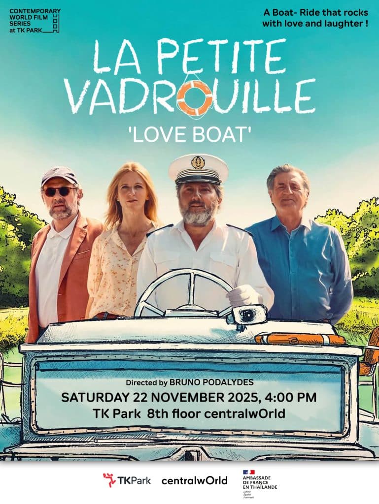 The November film in TK Park’s Contemporary World Film Series is La Petite Vadrouille (Love Boat), a French situational comedy directed by Bruno Podalydès. The story follows a scheme-filled “romantic” boat trip where a married woman, her husband and their friends stage a low-budget luxury cruise to extract €14,000 from a wealthy investor. The film is packed with lively characters and light-hearted moments.