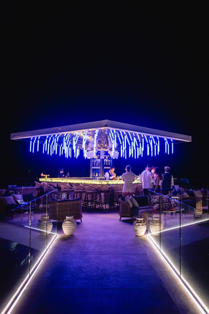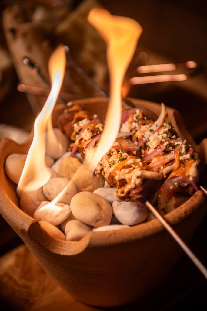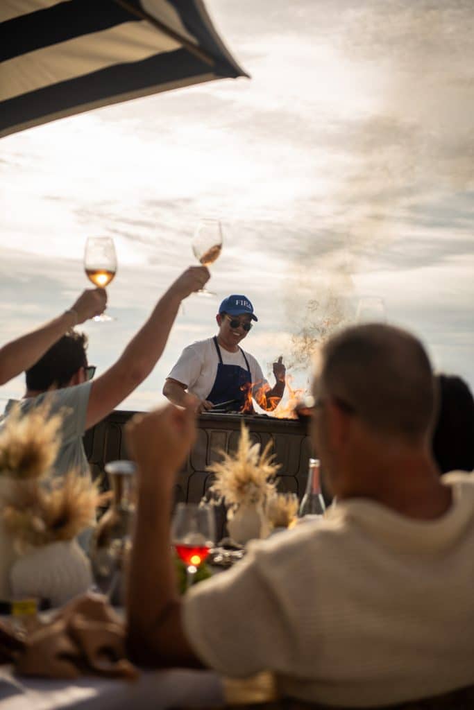 The gentle roar of open fire and the scent of spice rise into the cooling air while deep, hypnotic sounds and the texture of live percussion guide the evening into a slow rhythm. Performers navigate the terraces with ease, flames flicker against the pool’s surface and the light of the setting sun softens into a warm glow that seems to suspend time for those who gather there. The ritual does not rush. It moves with intention and creates a feeling that something special is taking place.