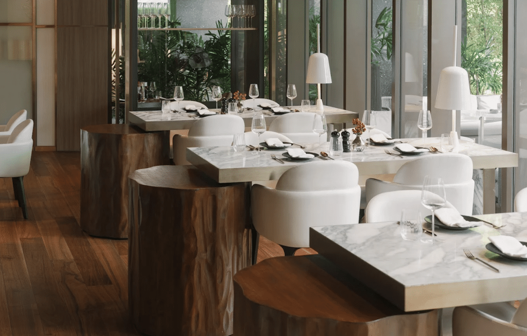 At Riva del Fiume, tall windows overlook the pools and the Chao Phraya River, which echo the relaxed charm of Lake Como. Chef Andrea Accordi presents modern Italian cuisine shaped by the seasons. The restaurant offers a rare experience in Bangkok that reimagines Japanese dining through pizza, known as Pizza 365° omakase.
