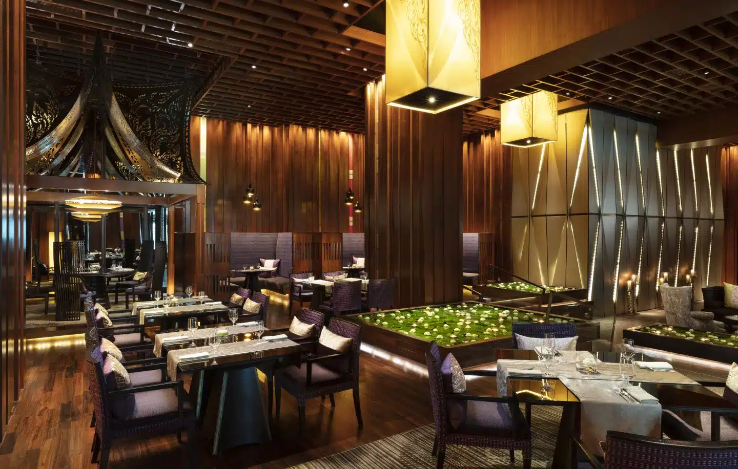 Chef Henrik Yde-Andersen’s Sra Bua by Kiin Kiin, located at Siam Kempinski Hotel Bangkok, was a pioneer in marrying molecular gastronomy and Thai cuisine. Years later, this fine dining mainstay continues to playfully innovate and captivate the senses. An interior of contemporary Thai elegance sets the mood as you are led to an ante lounge to sit back and sample seven small bites to arouse your palate in advance of the Legends of the Lotus experience. Among an enticing array, smoked mussels fried in tempura miso clam juice emulsion with seaweed sesame crisps stands out. Once seated in the main dining area, beside a lighted lotus pond (the “sra bua” of the restaurant’s name), the voyage begins. Chef Chayawee Sutcharitchan has crafted a six-course set menu, combining ingredients in novel ways whilst staying true to the essence of Thai cuisine. Highlights include slow-cooked beef with burnt onions, caramelized coconut chili sauce, and brown ginger, and ginger-marinated pineapple with spicy ceviche of white fish and kaffir lime leaves. When moving on to sweets, banana leaves and salted palm sugar ice cream catch the eye with accompanying coconut snow precipitated at the table. A selection of novel petits fours, including sticky rice and mango lego pieces, is an apt conclusion. Service is knowledgeable and impeccable throughout, and the wine or signature cocktail pairing rounds things out.